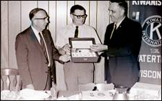 Kiwanis donation to Watertown Police Department. Erich Bartell, Kiwanis Lieutenant Governor and Kiwanian John Himrich. Sergeant Richard Reynolds of the Police Department.